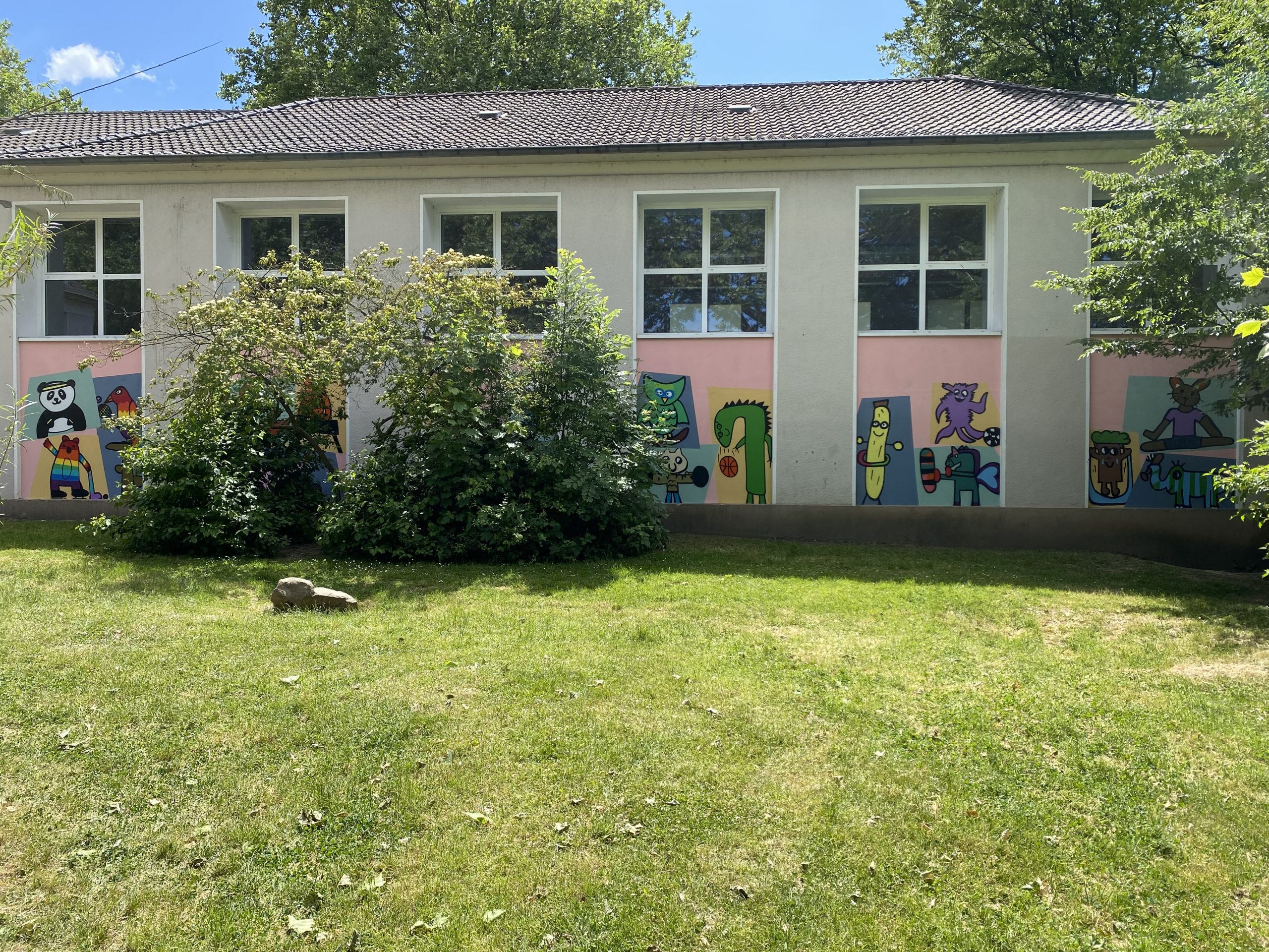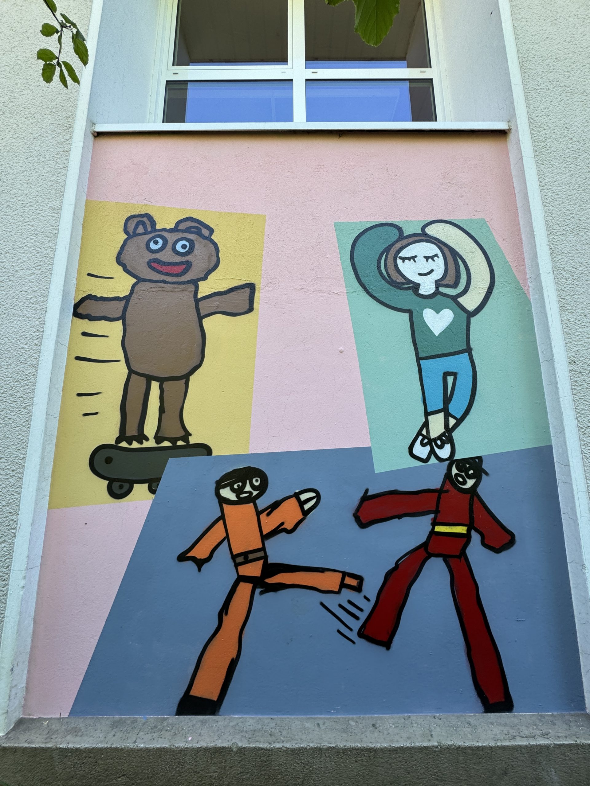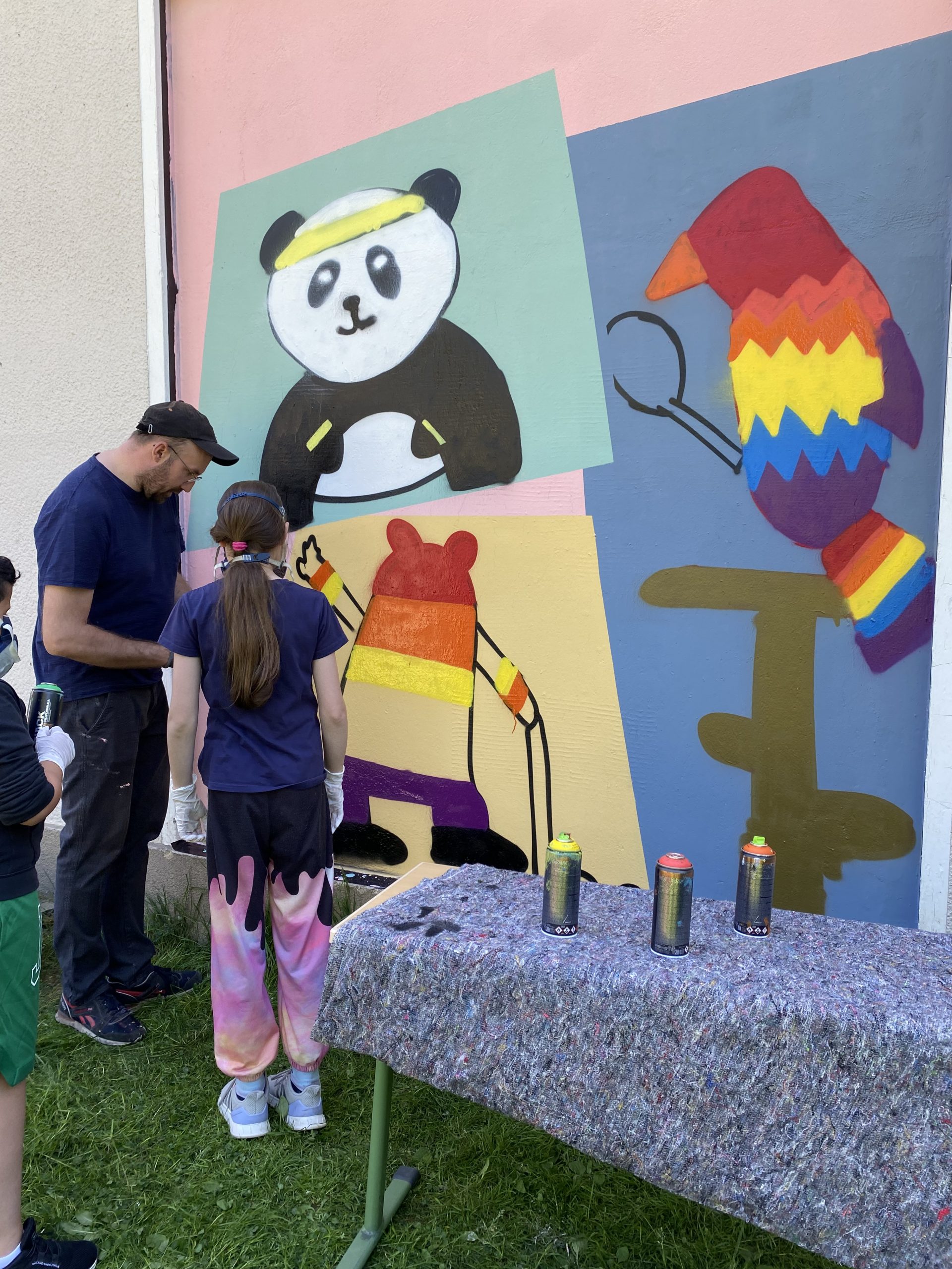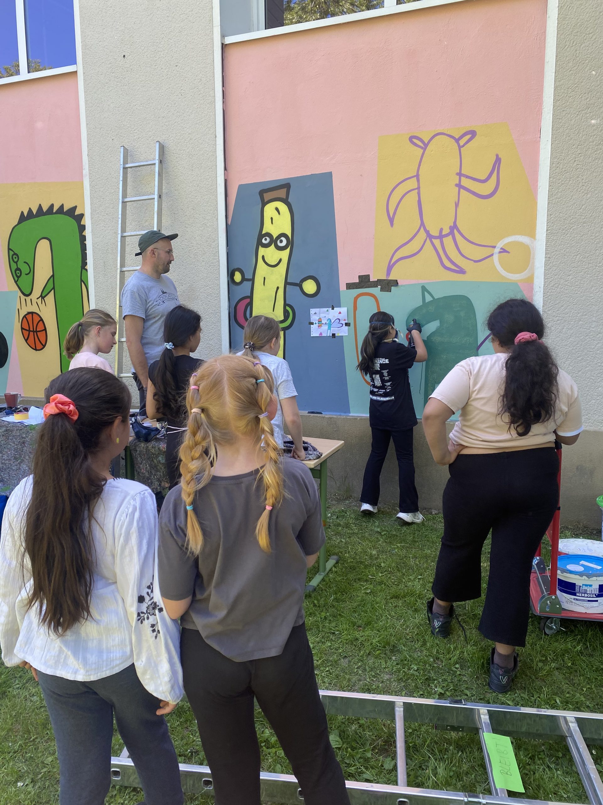 Bei diesem Kunstprojekt haben Viertklässler der Emil von Behring Schule, zunächst verschiedene Sportmotive auf Papier gezeichnet. Aus den zahlreichen eingereichten Zeichnungen, wurden insgesamt 18 Motive für die Wandgestaltung ausgewählt, und unter Anleitung an die Turnhalle auf dem Schulhof gesprüht.