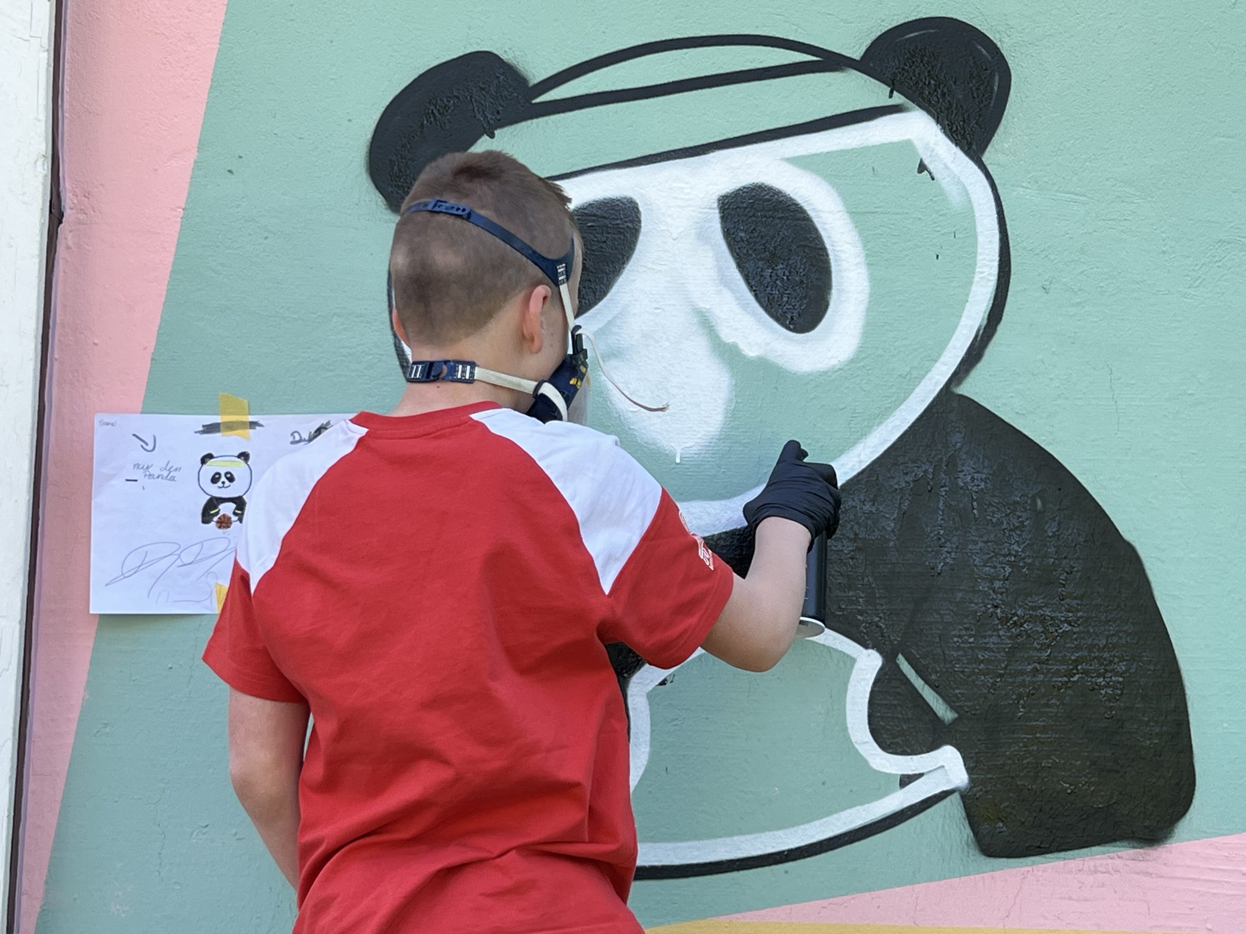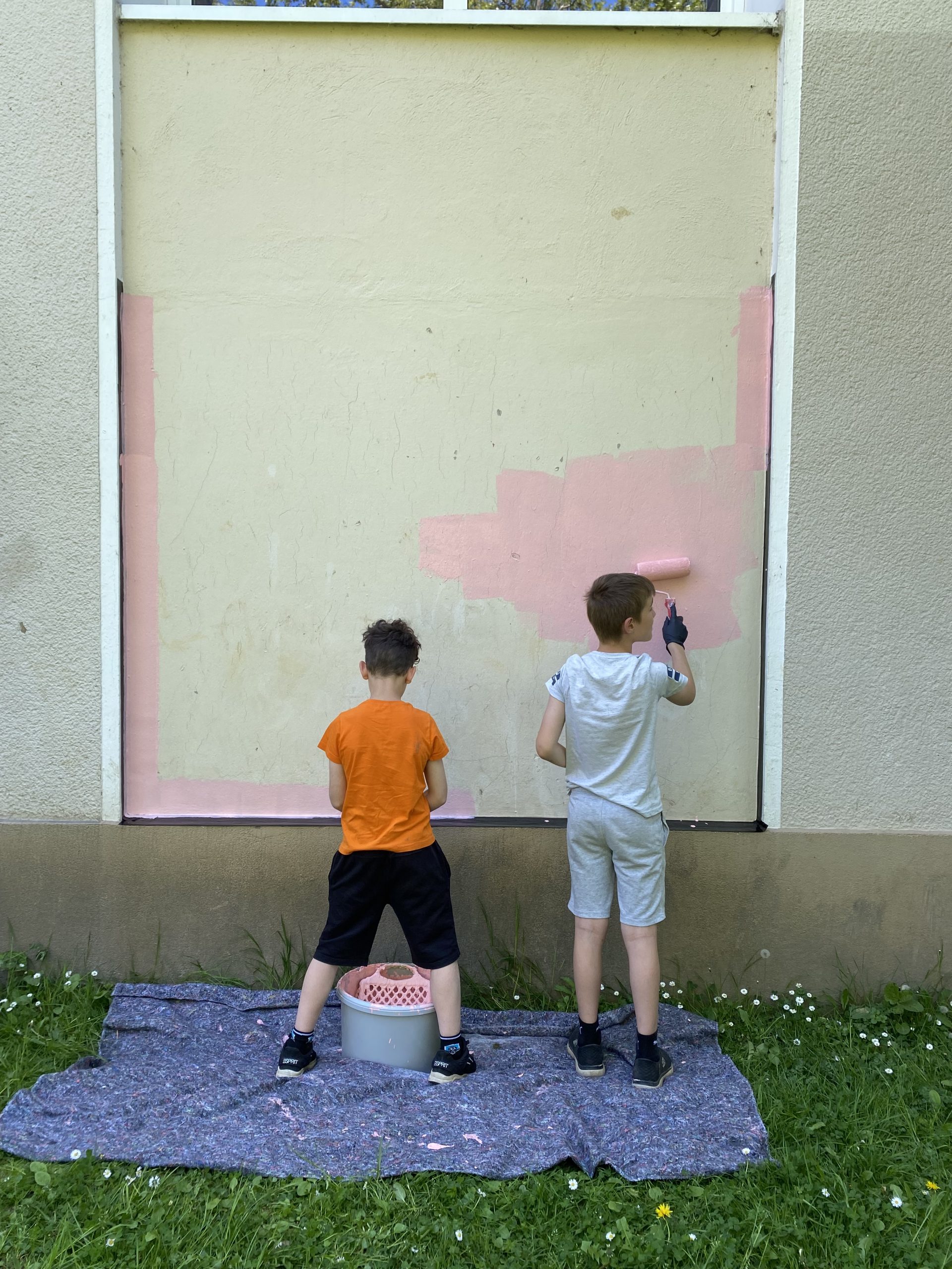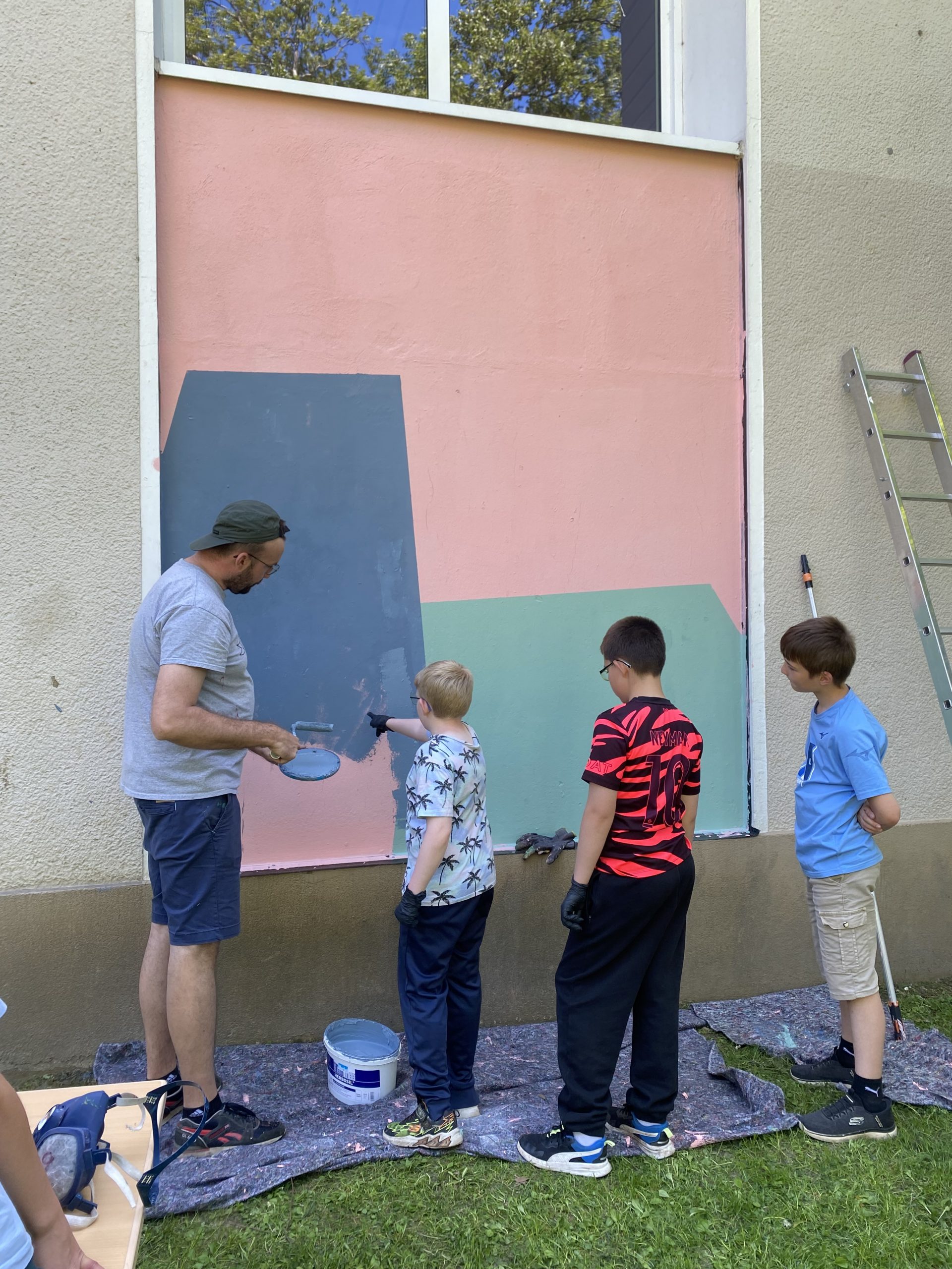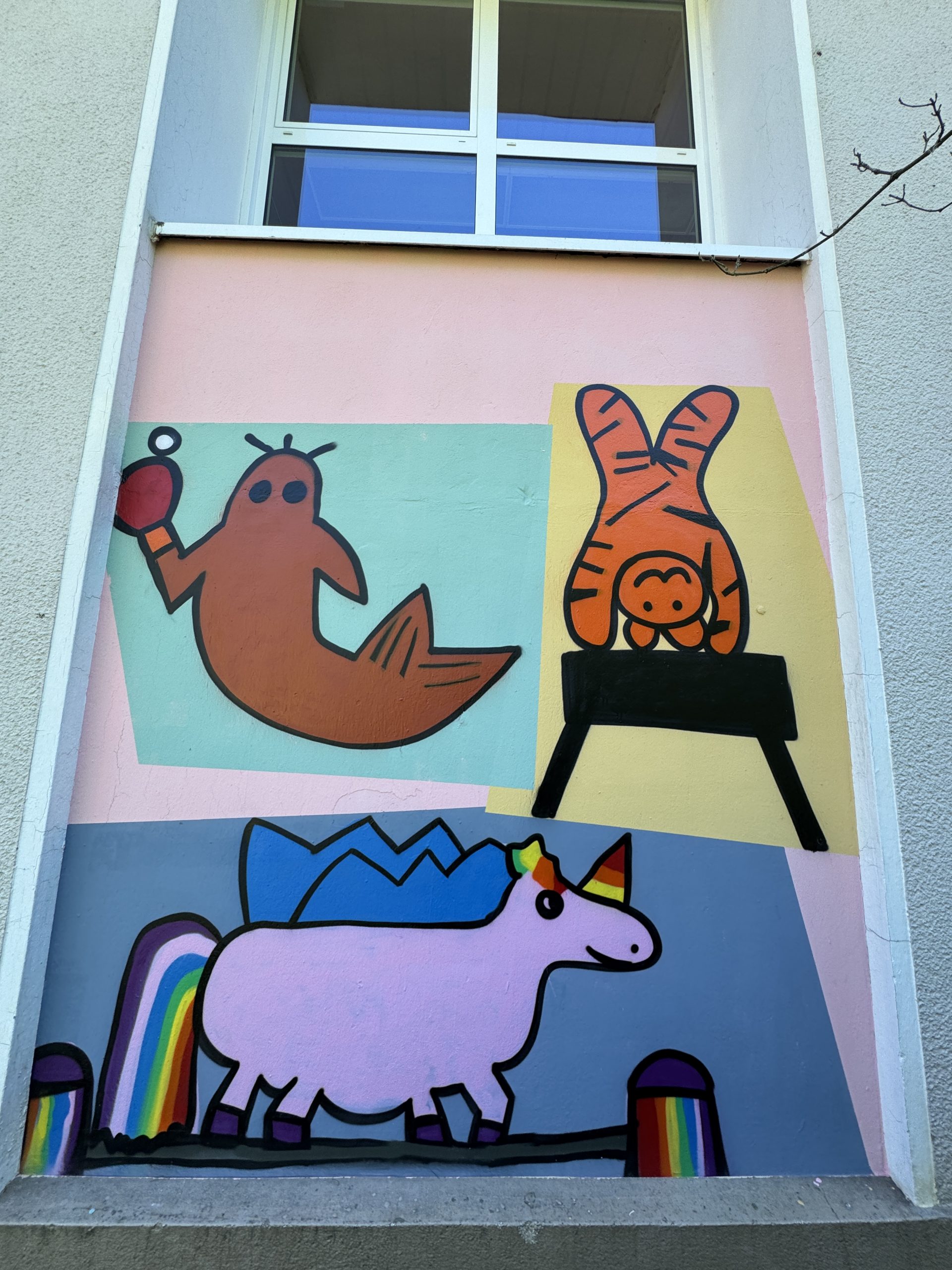 Bei diesem Kunstprojekt haben Viertklässler der Emil von Behring Schule, zunächst verschiedene Sportmotive auf Papier gezeichnet. Aus den zahlreichen eingereichten Zeichnungen, wurden insgesamt 18 Motive für die Wandgestaltung ausgewählt, und unter Anleitung an die Turnhalle auf dem Schulhof gesprüht.